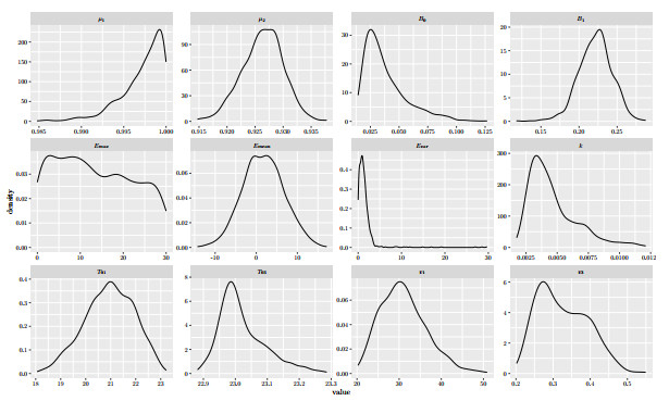 The posterior distributions of initial values of Model (2.1) for the 12 districts in Guangzhou city.