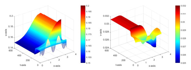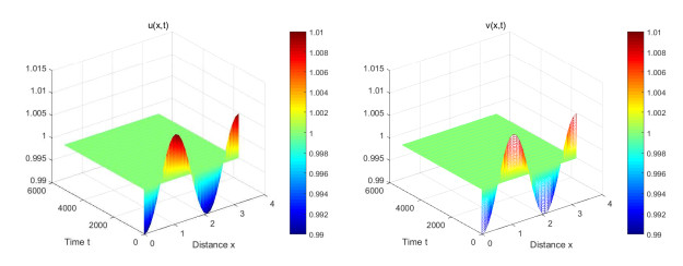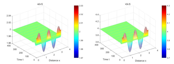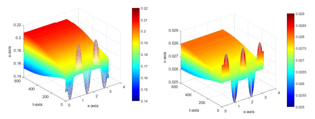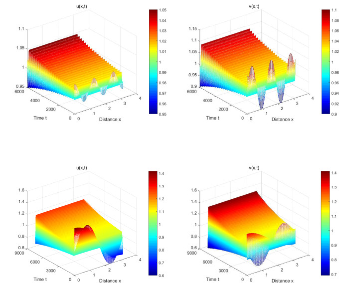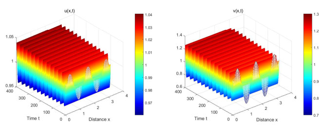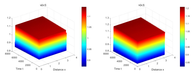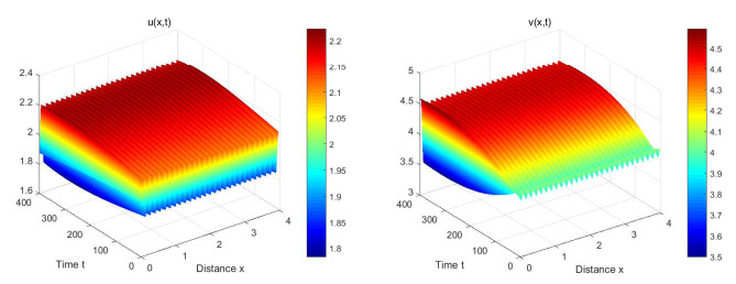 Positive periodic solution of (1.2) for b=6. Here, d=1.1 and the solution tends to a spatially homogeneous time periodic orbit. Left: u; right: v.