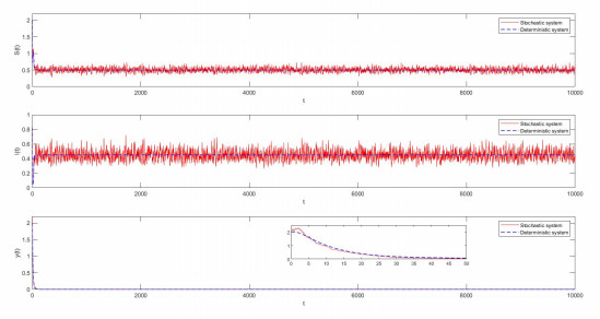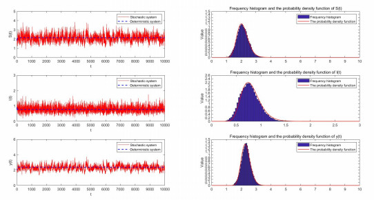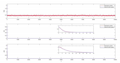 The figure on the left shows the solution of stochastic system and deterministic system when