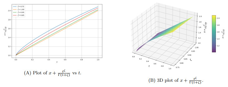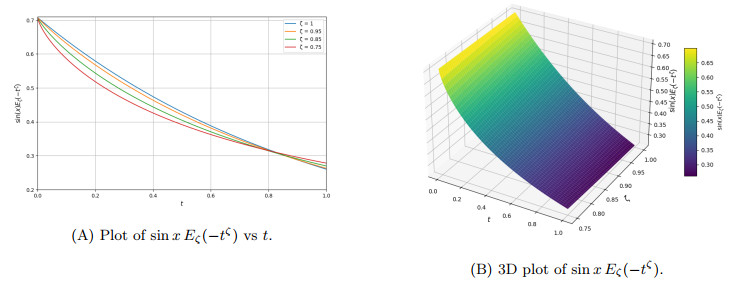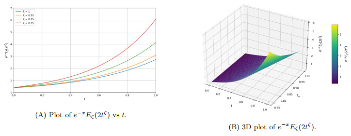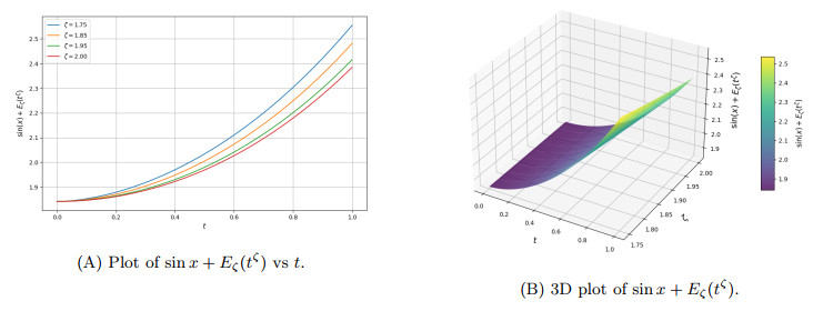 A) plot shows how the exact solution behaves when ζ = 2, compared to how it changes for different values of ζ = 1.95, 1.85, and 1.75. Each line represents the solution for one of these values of ζ, illustrating how the solution shifts as ζ decreases from 2. B) The surface graph of the solution f(x, t) for the Klein-Gordon equation at ζ = 1 for the problem in Example 5.3.
