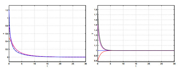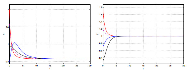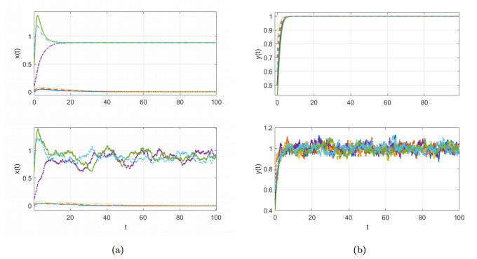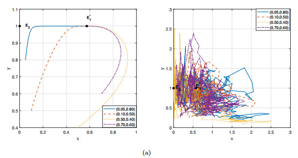 Taking the intial values as (0.01, 0.5), (0.03, 0.7), (0.05, 0.7), (0.2, 0.5), (0.5, 0.4), (0.8, 0.6)), plot the time series of populations x and y for the deterministic system (1.7) and the stochastic system (3.1) with σ = 0.05.