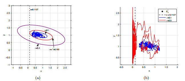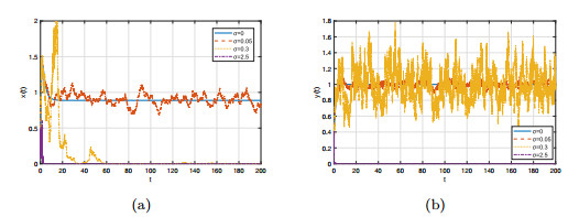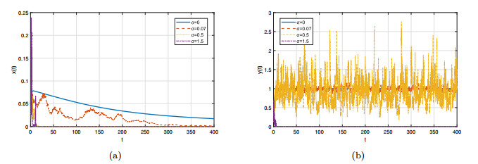 Take the initial value as (0.5, 0.4). When σ = 0.05, 0.3, 2.5, plot the time series of the two populations in the stochastic system (3.1).