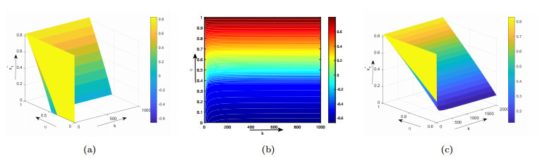 (a) Fix parameters (a, b, c, d, e, u) = (3, 1, 1.25, 1, 1, 1), (a) 3D plot of (k, η, x1*): The effects of fear level k and saturation parameter η on x1*, (b) contour plot corresponding to Figure (a), (c) 3D plot of (k, η, x1*) with k ∈ (0, 2000) and η ∈ (0.6, 1).
