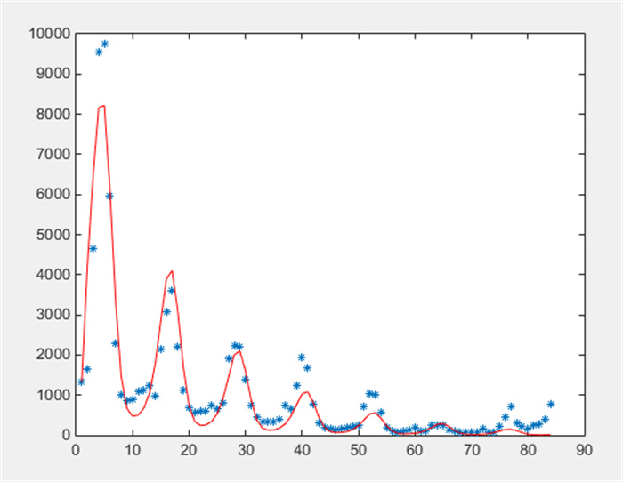 Comparison of reported cases of rubella in China from January 2012 to December 2018 and model (2.1) simulations, where time 0 represents January 1th, 2012, until December 31th, 2018.