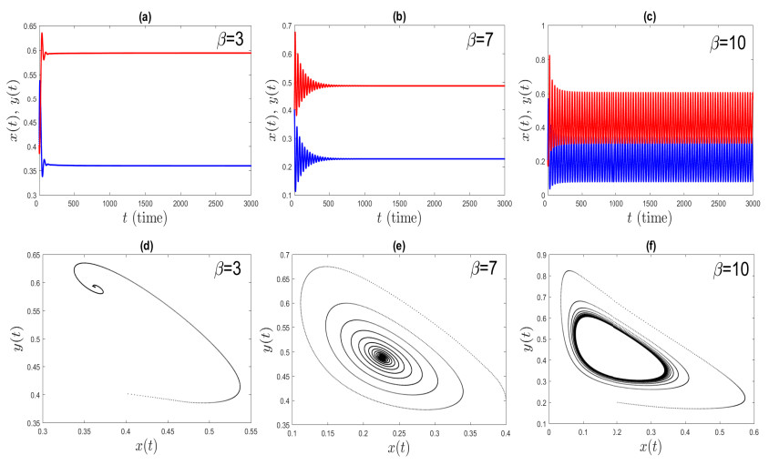 Time-series solutions and corresponding phase diagrams for different values of hunting cooperation parameter