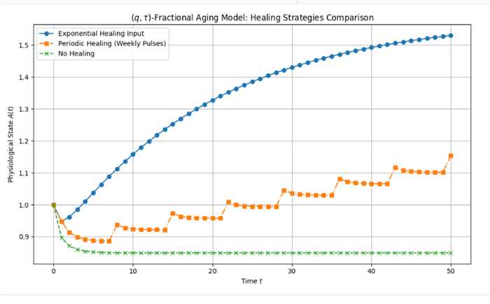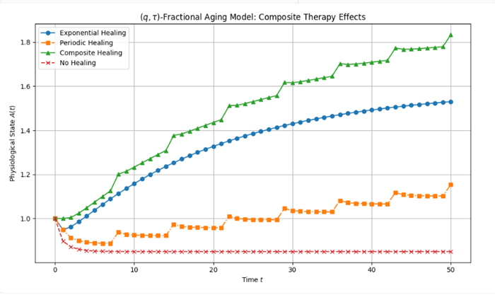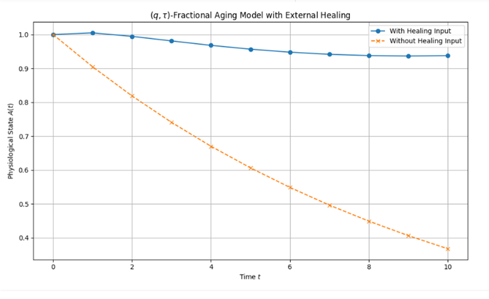We propose a novel $(q, \tau)$-fractional aging model that incorporates memory-dependent physiological decay and healing dynamics through a deformable time structure. The model generalizes classical aging laws by introducing a tunable fractional order $ \alpha $ and deformation parameters $ q $ and $ \tau $, which control the depth and scale of biological memory. External interventions, modeled as healing inputs, are integrated via generalized Mittag-Leffler kernels to capture both cumulative and periodic therapeutic effects. Simulation results demonstrate that composite healing strategies significantly delay decline and improve physiological resilience. Parameter sensitivity analysis reveals that the model flexibly adapts to different aging profiles by adjusting memory and deformation parameters. Using synthetic data, we validate the model's fitting accuracy through numerical optimization, achieving high fidelity with low residual error. The key advantage of the $(q, \tau)$-fractional approach lies in its ability to encode long-term memory effects and nonuniform biological time flow, enabling realistic modeling of aging phenomena beyond exponential decay. The framework is robust under noisy conditions and extensible to data-driven calibration, making it a powerful tool for biomedical aging analysis, intervention design, and longitudinal health forecasting.