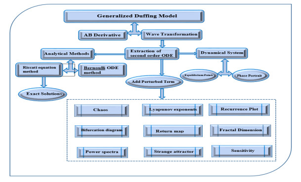 In this research, we analyze the fractional generalized reaction Duffing model (FGRDM) within the framework of Atangana’s conformable derivative, providing a novel approach to modeling memory and hereditary characteristics in nonlinear dynamical systems. To determine exact analytical solutions, we utlize a hybrid methodology combining the Riccati sub-equation method and the Riccati–Bernoulli sub-ODE method. This integrated approach successfully yields a wide variety of soliton solutions, such as dark, bright, M-shape, combo, periodic, singular, and mixed hyperbolic wave structures. Beyond the analytical construction of solutions, we present a detailed qualitative analysis of the governed model, both in its perturbed and unperturbed forms, through bifurcation and chaos investigations. To explore the nonlinear behavior and chaotic dynamics, we employ a suite of diagnostic tools, such as Poincaré sections, return maps, Lyapunov exponents, time series analysis, power spectra, strange attractors, recurrence plots, and fractal dimension estimation. These tools help uncover the rich and sensitive dependency of the system on initial conditions and parameter variations, suggesting transitions between periodic, quasi-periodic, and chaotic regimes. The importance of this work lies in its comprehensive analytical and numerical analysis of the FGRDM using fractional calculus. It offers insights into the interplay between memory effects, nonlinearity, and chaos, thereby enhancing the comprehending of complex dynamical systems. Our research have potential applications in nonlinear science, particularly in fields where fractional-order models are used to explain physical phenomena with inherent damping and memory characteristics.