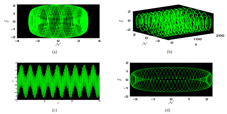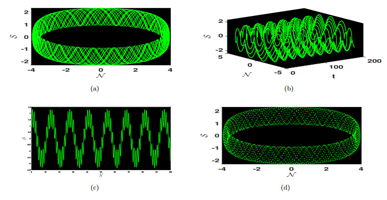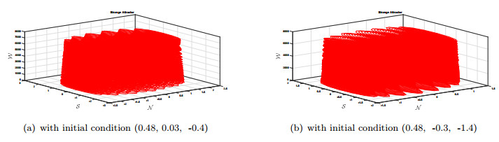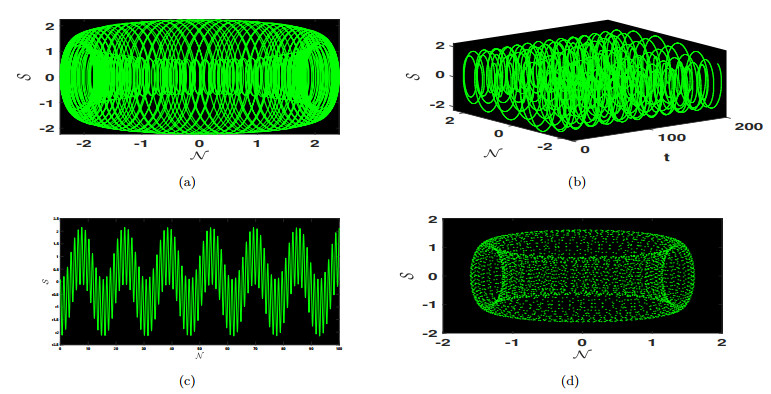Physical dynamics of chaos are illustrated using 2D and 3D, time series and poincare phase portraits for system (4.4) obtained by varying the values of