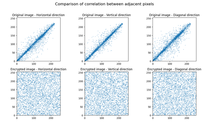 The correlation between the original image and the encrypted image in the horizontal, vertical, and diagonal directions.